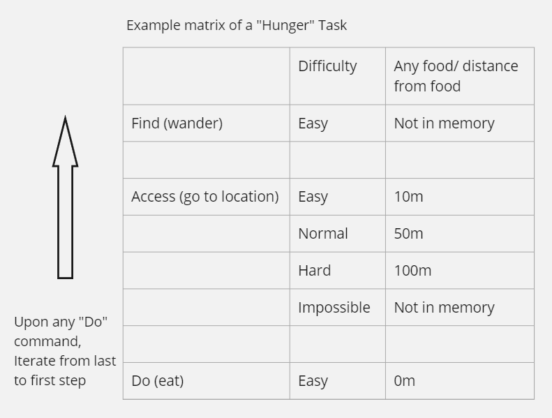 On the crust, we combine state machines and score-based systems so that the AI will choose a task to act on based on the level of stress it experiences, e.g., how hungry it is. Then it evaluates the difficulty of lowering that stress (eating something) by checking if it has ever seen any food/its distance from the food, etc. If the task is not too urgent (say, it’s not too hungry), it’ll proceed to check if it has other needs. If it does and if those are easily resolvable, it’ll go and do those first. For example, if it starts to also get a bit thirsty while looking for food, and there’s a glass of water nearby, it’ll drink the water first before proceeding to access the burger across the room.