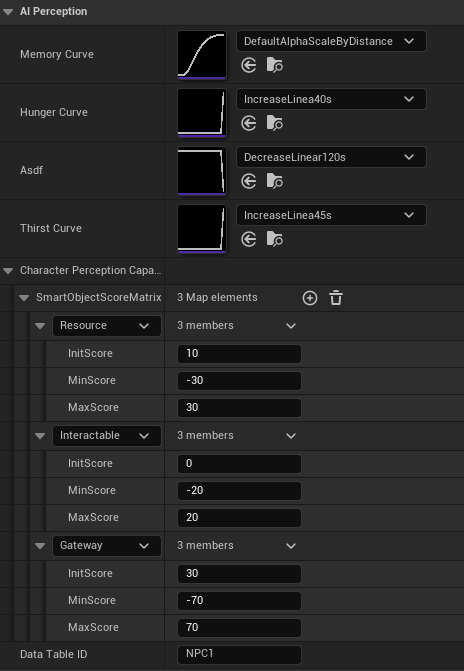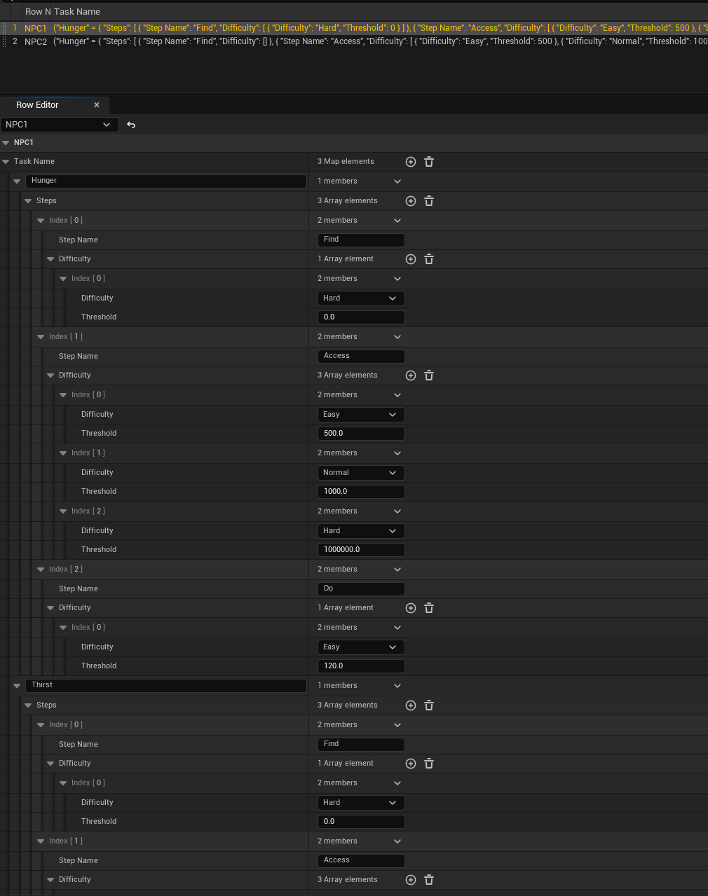 On the right is where we lay down every step the AI needs to take in order to meet its need. Notice how we’re homogenizing the tasks so that their actual actionable steps become similar, i.e., a “Thirst” task will look almost identical to the “Hunger” task, while an “Attack” task would also include Find (the target), Access (the target’s last known position), and Do (Shoot). The actual Data Table is shown below.