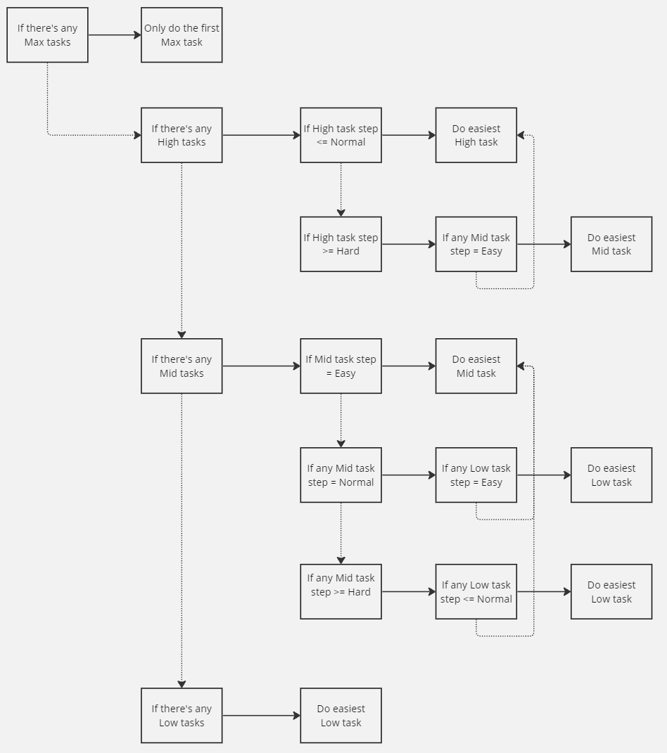 - The AI knows how close it is to completing each task, therefore choosing the correct task when presented with equally urgent tasks.